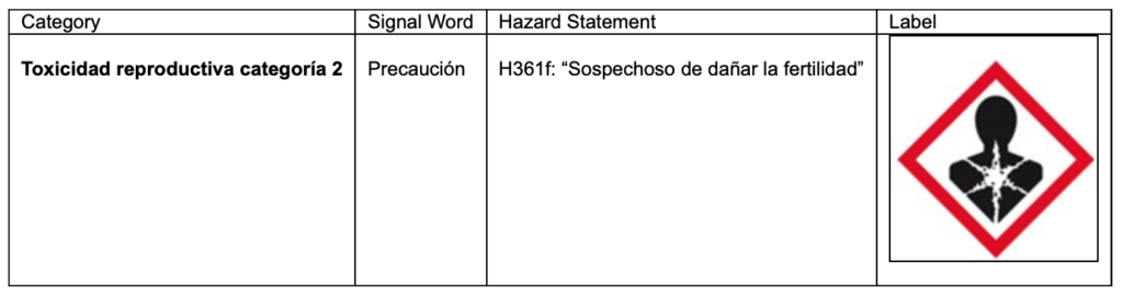 El riesgo para la salud humana está suficientemente controlado por las medidas de gestión de riesgos y las condiciones operativas indicadas en la (e)SDS para CAS 3006-82-4. Por lo tanto, no hay preocupación con respecto a la toxicidad reproductiva para los trabajadores.