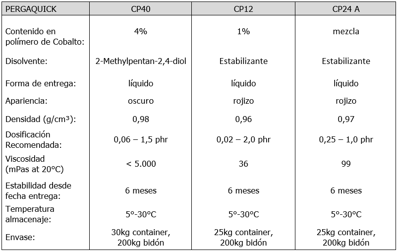 Una gran ventaja de PERGAQUICK CP11, CP12 X o CP24 AX es que no hay que ajustar la dosificación. Solo PERGAQUICK CP40 (4% Cobalto metal) necesita ajustar la dosificación considerando un factor 2.5 en comparación a PERGAQUICK C100 (10% Cobalto metal). Otras formulaciones de Polímero de Cobalto están disponibles bajo pedido.